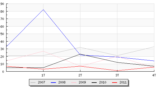 En todo el año 2011 el número de transacciones en el municipio de Guijuelo ha sido de 17 un 63,83% menos que en el mismo periodo del año anterior hasta el cuarto trimestre (47 Transacciones).