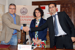 Comunicación Universidad de Salamanca / La directora general del Parque Científico de la Universidad de Salamanca y vicerrectora de Investigación de la institución académica, Mª Ángeles Serrano García, el gerente del Parque, José Miguel Sánchez Llorente, y Julián Ramos Manzano, administrador de la empresa Biorama, han suscrito un convenio de colaboración en la mañana de hoy para la adhesión de la firma al Parque Científico.