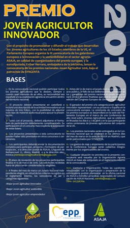 asajacyl.com / La Asociación Agraria Jóvenes Agricultores -ASAJA- convoca un año más el Concurso Nacional Joven Agricultor Innovador con el propósito de promover y difundir los proyectos empresariales de los jóvenes agricultores y ganaderos españoles. En esta tercera edición el plazo de presentación de los proyectos será del 15 de febrero al 15 de marzo ambos inclusive y a finales del mes de marzo se darán a conocer los ganadores, así como el joven finalista que representará a España en la convocatoria europea.