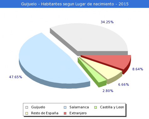 Según los datos publicados por el Instituto Nacional de Estadística procedentes del padrón municipal de 2015 el 34.25% de los habitantes empadronados en el Municipio de Guijuelo han nacido en dicho municipio. Así el 57.11% han emigrado a Guijuelo desde diferentes lugares de España.