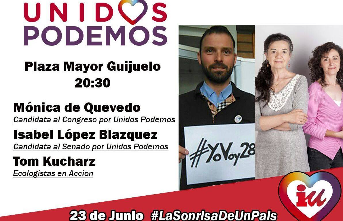 Desde la coalición Unidos Podemos (Izquierda Unida+Podemos+Equo) invitan a toda la ciudadanía al próximo acto de campaña que realizarán en Guijuelo y al cual asistirán dos miembros de la candidatura de Unidos Podemos en la provincia acompañadas por el activista Tom Kucharz y presentado por Miguel Rodero (Coordinador Provincial de IU en Salamanca).
