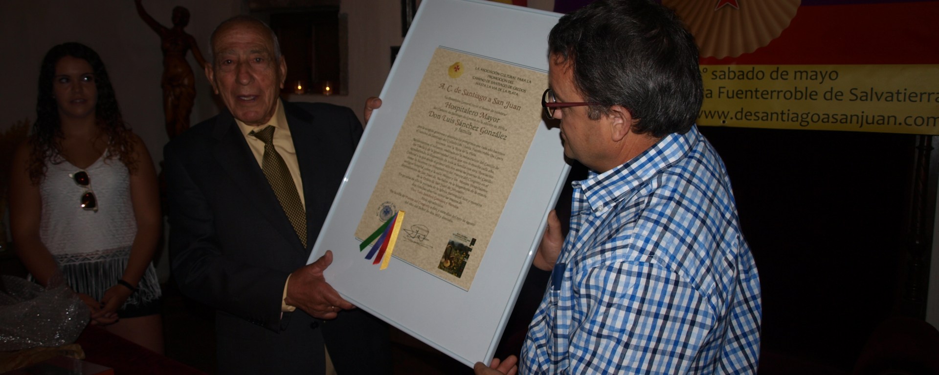 El premio fue entregado por José López García, alcalde de La Horcajada (Ávila), ayuntamiento que desde hace 3 años viene apoyando la ruta incondicionalmente, y por Carla Sánchez Izquierdo, hija de Isidoro Sánchez, promotor de esta ruta a través de la A.C. De Santiago a San Juan, que este año tras la puesta en marcha de las nuevas subvenciones de los Grupos de Acción Local van a solicitar subvención para señalizar este camino desde Gredos hasta Fuenterroble, uniendo en el proyecto a todos los ayuntamientos que lo deseen y a los tres G.A.L. , ASIDER, ADRISS y ADRECAG.