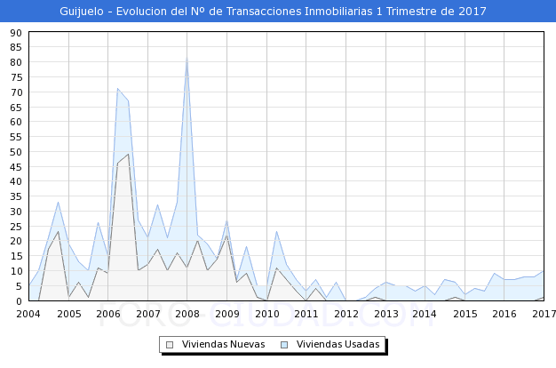 Según los datos del primer trimestre del año 2017 publicados por el Ministerio de Vivienda, el número de transacciones inmobiliarias en el municipio de Guijuelo asciende a un total de 10, un 42.86% mas que en el primer trimestre del año 2016.