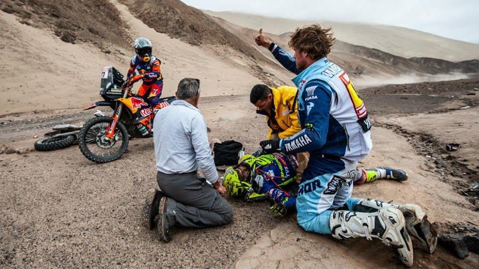 Estaba siendo la sensación del Dakar en la categoría de motos, pero Lorenzo Santolino no va a poder corroborar pasando la línea de meta final la buenísima impresión que ha dado. Era el mejor rookie, el mejor español y rozaba el top ten en la general, pero una caída le impedirá completar su primera Dakar. El guijuelens ha tenido que abandonar hoy en el inicio de la sexta etapa del rally por una caída en el kilómetro 33, y ha sido evacuado por los servicios médicos de la carrera aunque su estado físico es bueno. La organización del Dakar ha confirmado que sufre un traumatismo craneoencefálico, sin fracturas, y está siendo trasladado al hospital de Lima.