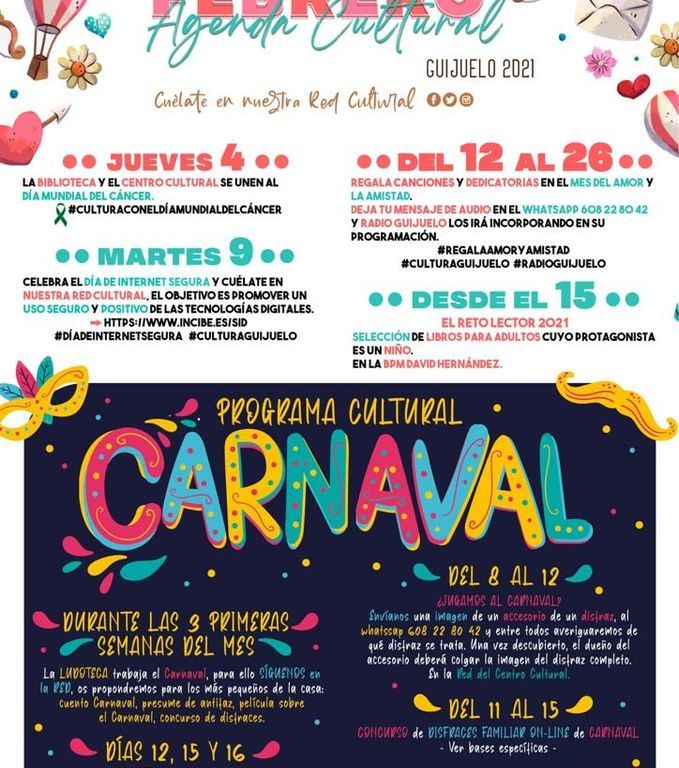 Los guijuelenses van a poder disfrutar en este mes de febrero del carnaval. Eso sí, dada la situación de la pandemia lo podrán hacer online. Así ha quedado fijado en la agenda Cultural, que además ofrece otra serie de propuestas para compartir de forma telemática en los días previos y posteriores al carnaval.
