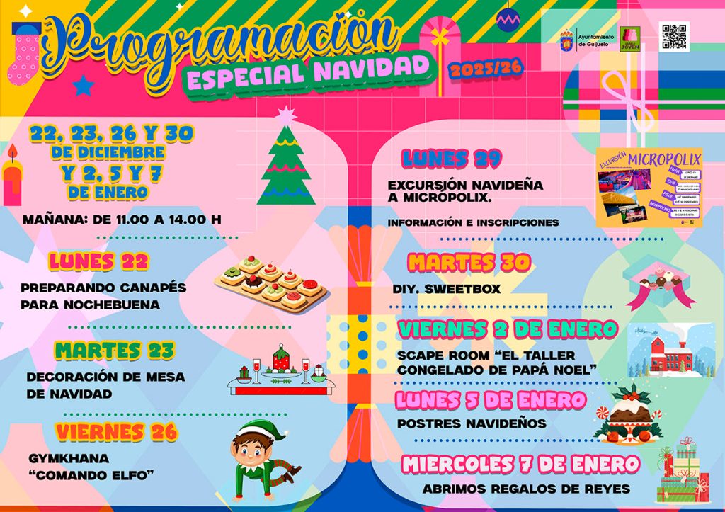 Por otro lado, también se ha presentado la programación especial Navidad en el Centro Joven con apertura por las mañanas los días 22, 23, 26 y 30 de diciembre, además del 2, 5 y 7 de enero. Destaca la excursión navideña a Micropolix con precio especial para empadronados y las actividades relacionadas con la gastronomía y scape room de Navidad.