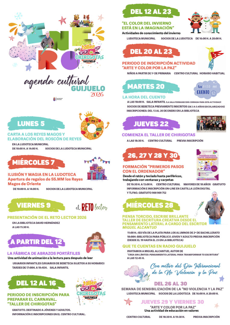 La formación será clave también este mes con diferentes propuestas como ‘Primeros pasos con el ordenador’, para mayores de 18 años, la nueva sesión de La Hora del Cuento, talleres de escritura para los jóvenes del IES y el resto de público joven y adulto de Guijuelo, el primer QTC del año en Radio Guijuelo con Miguel Alcantud, además de la semana de sensibilización por el Día Internacional de la No Violencia y la Paz.