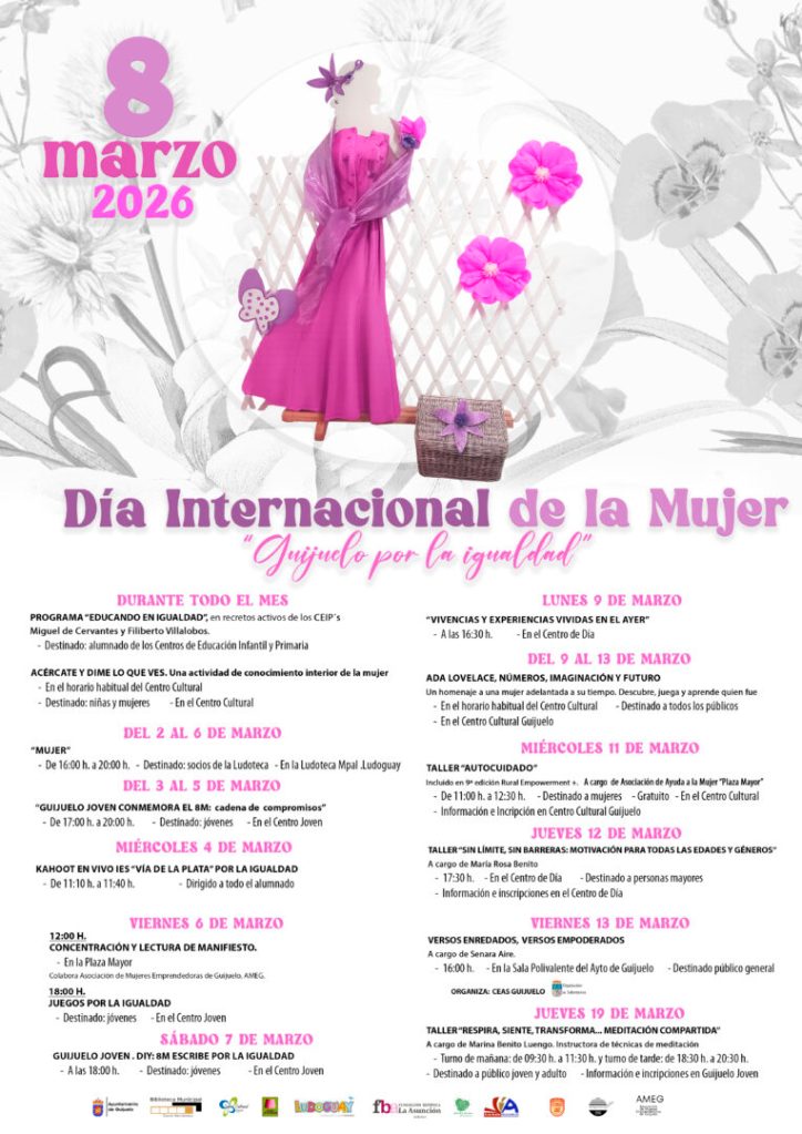 Con motivo del Día Internacional de la Mujer, 8M, Guijuelo conmemora este día con un amplio programa que se celebrará con la colaboración de varias áreas municipales como en el Centro Cultural, Ludoteca, Centro Joven o Centro de Día, además de los centros educativos, que acogerán propuestas y talleres adaptados a los grupos de edad.