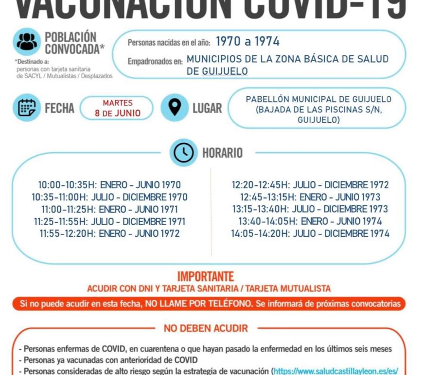 La Gerencia de Atención Primaria ha confirmado el llamamiento para los vecinos de la Zona Básica de Salud de Guijuelo que hayan nacido entre 1970 y 1974. Tendrán que acudir el próximo martes día 8 al pabellón de Deportes de Guijuelo, para recibir la vacuna frente a la covid-19. La jornada comenzará a las 10 horas con los nacidos entre enero y junio de 1970 … Continúa leyendo El martes 8 de junio vacunarán a las personas nacidas entre 1970 y 1974