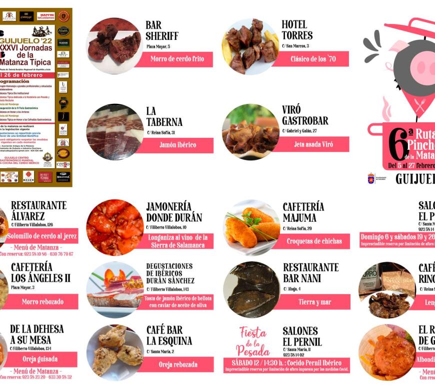 Este sábado arranca la nueva edición de la Ruta de Pinchos de la Matanza que se desarrollará hasta el próximo 27 de febrero. Un total de quince establecimientos participarán en la 6ª Ruta de Pinchos en la que, cada uno, elaborará tapas con distintas partes del cerdo ibérico. Entra las propuestas que ofrece cada local de hostelería se podrán degustar tostas de jamón ibérico, morro … Continúa leyendo Este sábado arranca la 6ª Ruta de Pinchos de la Matanza de Guijuelo